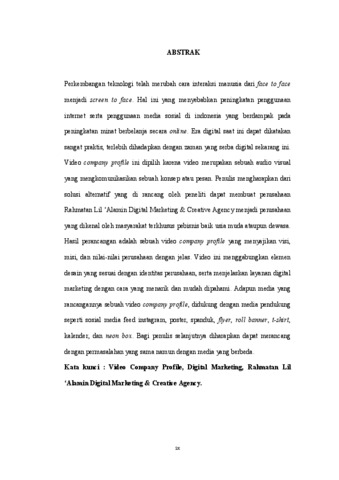 Perkembangan teknologi telah merubah cara interaksi manusia dari face to face menjadi screen to face. Hal ini yang menyebabkan peningkatan penggunaan internet serta penggunaan media sosial di indonesia yang berdampak pada peningkatan minat berbelanja secara online. Era digital saat ini dapat dikatakan sangat praktis, terlebih dihadapkan dengan zaman yang serba digital sekarang ini. Video company profile ini dipilih karena video merupakan sebuah audio visual yang mengkomunikasikan sebuah konsep atau pesan. Penulis mengharapkan dari solusi alternatif yang di rancang oleh peneliti dapat membuat perusahaan Rahmatan Lil ‘Alamin Digital Marketing & Creative Agency menjadi perusahaan yang dikenal oleh masyarakat terkhusus pebisnis baik usia muda ataupun dewasa. Hasil perancangan adalah sebuah video company profile yang menyajikan visi, misi, dan nilai-nilai perusahaan dengan jelas. Video ini menggabungkan elemen desain yang sesuai dengan identitas perusahaan, serta menjelaskan layanan digital marketing dengan cara yang menarik dan mudah dipahami. Adapun media yang rancangannya sebuah video company profile, didukung dengan media pendukung seperti sosial media feed instagram, poster, spanduk, flyer, roll banner, t-shirt, kalender, dan neon box. Bagi penulis selanjutnya diharapkan dapat merancang dengan permasalahan yang sama namun dengan media yang berbeda.