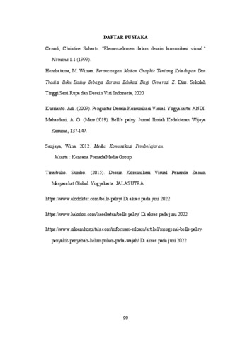 Perancangan media Motion Graphic ini bertujuan untuk meningkatkan kesadaran dan pemahaman masyarakat mengenai Bell's Palsy, sebuah kondisi medis yang dapat menyebabkan kelumpuhan pada sisi wajah. Dengan menggunakan pendekatan kreatif melalui visualisasi animasi dan desain yang menarik, Tugas ini bertujuan untuk mengatasi ketidak pahaman tentang penyebab, gejala, pengobatan, dan dampak kondisi ini, serta mengurangi stigmatisasi yang terkait dengannya. Media motion grapchic ini diharapkan dapat memberikan informasi yang akurat dan mudah dipahami tentang Bell's Palsy kepada audiens berbagai lapisan masyarakat. Melalui kombinasi penjelasan visual dan narasi yang jelas, Tugas akhir ini bertujuan untuk memotivasi masyarakat terutama orang tua yang apa bila anaknya Terkena Bell’s palsy untuk mencari perawatan medis yang tepat, Serta tambahan media pendukung seperti poster, spanduk, x-banner dan Brosur serta merchandise, pena, gelas dan tote bage. Juga dapat diakses melalui media social Instagram dan you tube.