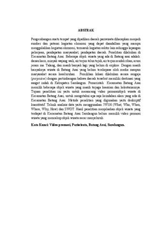 Pengembangan suatu tempat yang dijadikan daerah pariwisata diharapkan menjadi sumber dan potensi kegiatan ekonomi yang dapat diandalkan yang mampu menggalakkan kegiatan ekonomi, termasuk kegiatan sektor lain sehingga lapangan pekerjaan, pendapatan masyarakat, pendapatan daerah. Penelitian dilakukan di Kecamatan Batang Asai. Beberapa objek wisata yang ada di Batang asai adalah: danau kaco, minyak wajang wali, air terjun telun tujuh, air terjun mudek riban, arum jeram ma. Talang, dan masih banyak lagi yang belum di explore. Dengan masih banyaknya wisata di Batang Asai yang belum terekspose oleh media maupun masyarakat secara keseluruhan. Pemilihan lokasi dilakukan secara sengaja (purposive) dengan pertimbangan bahwa daerah tersebut memiliki destinasi yang sangat indah di Kabupaten Sarolangun. Pemerintah Kecamatan Batang Asai memilik beberapa objek wisata yang masih terjaga keasrian dan kelestariannya. Tujuan penelitian ini yaitu untuk merancang video promosiobjek wisata di Kecamatan Batang Asai, untuk mengetahui apa saja keindahan alam yang ada di Kecamatan Batang Asai. Metode penelitian yang digunakan yaitu deskriptif kuantitatif. Teknik analisis data yaitu menggunakan 5W1H (What, Who, When, Where, Why, How) dan SWOT. Hasil penelitian menjelaskan objek wisata yang terdapat di Kecamatan Batang Asai Sarolangun belum memilik video promosi wisata yang mencakup objek wisata secar menyeluruh. Kata Kunci: Video promosi, Pariwisata, Batang Asai, Sarolangun.