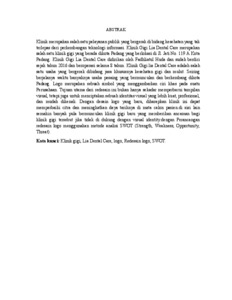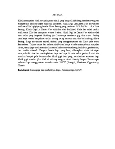 Klinik merupakan salah satu pelayanan publik yang bergerak di bidang kesehatan yang tak terlepas dari perkembangan teknologi informasi. Klinik Gigi Lia Dental Care merupakan salah satu klinik gigi yang berada dikota Padang yang berlokasi di Jl. Jati No. 119 A Kota Padang. Klinik Gigi Lia Dental Care didirikan oleh Fadhliatul Huda dan sudah berdiri sejak tahun 2016 dan beroperasi selama 8 tahun. Klinik Gigi lia Dental Care adalah salah satu usaha yang bergerak dibidang jasa khususnya kesehatan gigi dan mulut. Seiring berjalanya waktu banyaknya usaha pesaing yang bermunculan dan berkembang dikota Padang. Logo merupakan sebuah simbol yang menggambarkan ciri khas pada suatu Perusahaan. Tujuan utama dari redesain ini bukan hanya sekadar memperbarui tampilan visual, tetapi juga untuk menciptakan sebuah identitas visual yang lebih kuat, profesional, dan mudah dikenali. Dengan desain logo yang baru, diharapkan klinik ini dapat memperbaiki citra dan meningkatkan daya tariknya di mata calon pasien.di sisi lain semakin banyak pula bermunculan klinik gigi baru yang memberikan ancaman bagi klinik gigi tersebut jika tidak di dukung dengan visual identity.dengan Perancangan redesain logo menggunakan metode analisi SWOT (Strength, Weakness, Opportunity, Threat). Kata kunci: Klinik gigi, Lia Dental Care, logo, Redesain logo, SWOT