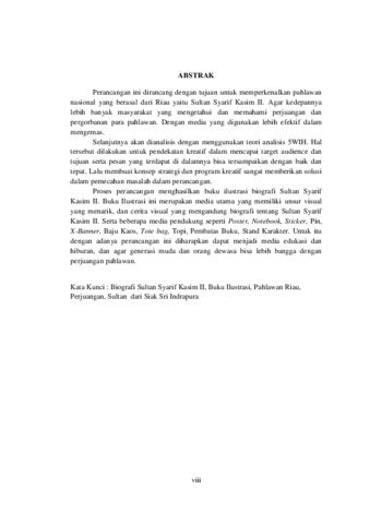 Perancangan ini dirancang dengan tujuan untuk memperkenalkan pahlawan nasional yang berasal dari Riau yaitu Sultan Syarif Kasim II. Agar kedepannya lebih banyak masyarakat yang mengetahui dan memahami perjuangan dan pergorbanan para pahlawan. Dengan media yang digunakan lebih efektif dalam mengemas. Selanjutnya akan dianalisis dengan menggunakan teori analisis 5WIH. Hal tersebut dilakukan untuk pendekatan kreatif dalam mencapai target audience dan tujuan serta pesan yang terdapat di dalamnya bisa tersampaikan dengan baik dan tepat. Lalu membuat konsep strategi dan program kreatif sangat memberikan solusi dalam pemecahan masalah dalam perancangan. Proses perancangan menghasilkan buku ilustrasi biografi Sultan Syarif Kasim II. Buku Ilustrasi ini merupakan media utama yang memiliki unsur visual yang menarik, dan cerita visual yang mengandung biografi tentang Sultan Syarif Kasim II. Serta beberapa media pendukung seperti Poster, Notebook, Sticker, Pin, X-Banner, Baju Kaos, Tote bag, Topi, Pembatas Buku, Stand Karakter. Untuk itu dengan adanya perancangan ini diharapkan dapat menjadi media edukasi dan hiburan, dan agar generasi muda dan orang dewasa bisa lebih bangga dengan perjuangan pahlawan.