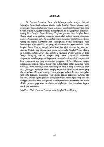 Di Provinsi Sumatera Barat ada beberapa usaha songket didaerahKabupaten Agam.Salah satunya adalah Usaha Songket Tenun Minang. vidiopromosi merupakan bentuk penayangan informasi yang bersifat audio visual yangbertujuan untuk menginformasikan, mempengaruhi da mengingatkan masyarakat tentang Kain Songket Tenun Minang. Kegiatan promosi Kain Songket TenunMinang dapat mengingatkan kesadaran masyarakat tentang budaya pemakaiansongket. Perancangan ini bertujuan untuk memperkenalkan Usaha Songket TenunMinang ini kepada masyarakat luas. Menciptakan sebuah perancangan VidioPromosi agar lebih memiliki citra yang baik di masyarakat, agar membuat UsahaSongket Tenun Minang menjadi lebih kuat dan lebih dikenali lagi dari segi identitas. Metode yang dipakai pada perancangan usaha Songket Tenun Minangini memakai metode SWOT dan metode perancangan Design Thingking. PadaDesign Thingking melalui tahapan yang mana (empathize) melakukanpengamatan terhadap pengguna bagaimana berinteraksi dengan lingkungan untukdapat memahami apa yang dibutuhkan pengguna, (define) dilakukan denganmerumuskan masalah utama, (ideate) ide distrukturkan untuk mencapai tujuandiciptakan video promosi,dimana usaha songket tenun minang memerlukandayatarik, (prototype) tujuannya untuk menguji aspek dari sebuah solusi desainyangtelah dihasilkan, (Test) yaitu menguji konsep dengan audiens. Promosi merupakansalah satu kegiatan pemasaran, baik dalam bidang komersial maupunnonkomersial. Dalam kegitan promosi mempunyai tujuan umum agar orang lainataupelanggan semakin sadar akan produk serta layanan suatu perusahaan atau bisnis. Melalui promosi juga akan membantu meningkatkan citra perusahaan kepadapublik atau masyarakat. Kata Kunci: Vidio Promosi, Promosi, usaha Songket Tenun Minang