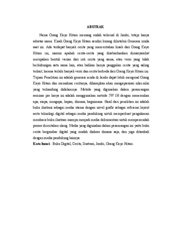 Nama Orang Kayo Hitam memang sudah terkenal di Jambi, tetapi hanya sebatas nama. Kisah Orang Kayo Hitam sendiri kurang diketahui Generasi muda saat ini. Ada terdapat banyak cerita yang menceritakan kisah dari Orang Kayo Hitam ini, namun apakah cerita-cerita yang disebarluaskan dimasyarakat merupakan bentuk varian dari inti cerita yang sama, atau versi yang tidak berhubungan satu sama lain, atau bahkan hanya penggalan cerita yang saling terkait, karena terlalu banyak versi dan cerita berbeda dari Orang Kayo Hitam ini. Tujuan Penelitian ini adalah generasi muda di Jambi dapat lebih mengenal Orang Kayo Hitam dan memaknai ceritanya, diharapkan akan mengapresiasi nilai-nilai yang terkandung didalamnya. Metode yang digunakan dalam perancangan seminar pre karya ini adalah menggunakan metode 5W 1H dengan menemukan apa, siapa, mengapa, kapan, dimana, bagaimana. Hasil dari penelitian ini adalah buku ilustrasi sebagai media utama dengan novel grafis sebagai referensi layout serta teknologi digital sebagai media pendukung untuk memperkuat pengalaman membaca buku ilustrasi mampu menjadi media dokumentasi untuk mempermudah proses diceritakan ulang. Media yang digunakan dalam perancangan ini yaitu buku cerita bergambar digital yang mudah diakses dimana saja, dan juga ditambah dengan media pendukung lainnya.