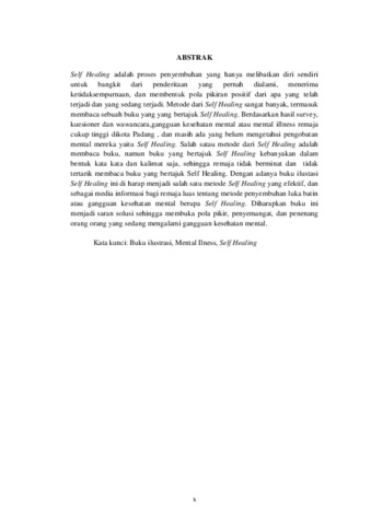 Self healing adalah proses penyembuhan yang hanya melibatkan diri sendiri untuk bangkit dari penderitaan yang pernah dialami, menerima ketidaksempurnaan, dan membentuk pola pikir positif dari apa yang telah terjadi dan yang sedang terjadi. Metode dari self healing sangat banyak, termasuk membaca sebuah buku yang bertajuk self healing. Berdasarkan hasil survey, kuesioner dan wawancara, gangguan kesehatan mental atau mental illness remaja cukup tinggi di Kota Padang, dan masih ada yang belum mengetahui pengobatan mental mereka yaitu self healing. Salah satu metode dari self healing adalah membaca buku, namun buku yang bertajuk self healing kebanyakan dalam bentuk kata-kata dan kalimat saja, sehingga remaja tidak berminat dan tidak tertarik membaca buku yang bertajuk self healing. Dengan adanya buku ilustrasi self healing ini diharapkan menjadi salah satu metode self healing yang efektif, dan sebagai media informasi bagi remaja luas tentang metode penyembuhan luka batin atau gangguan kesehatan mental berupa self healing. Diharapkan buku ini menjadi sarana solusi sehingga membuka pola pikir, penyemangat, dan penenang orang-orang yang sedang mengalami gangguan kesehatan mental.