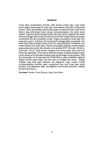 Setiap usaha membutuhkan identitas, salah satunya melalui logo. Logo bukan hanya sebagai tanda pengenal, tetapi juga menyampaikan informasi tentang usaha tersebut. Pokok permasalahan dalam perancangan ini adalah identitas visual Kamil Bakery yang sebelumnya belum mampu merepresentasikan citra usaha secara optimal. Logo lama dinilai kurang konsisten dari segi estetika, tipografi, dan makna simbolis sehingga tidak mampu memberikan kesan kuat kepada konsumen maupun membedakan diri dari perusahaan serupa. Dengan menciptakan desain logo baru yang lebih modern, sederhana, dan komunikatif, sehingga dapat memperkuat citra brand Kamil Bakery sebagai usaha roti dan kue yang profesional, berkualitas, serta mudah dikenali oleh target pasar. Metode perancangan dilakukan melalui tahapan pengumpulan data primer dan sekunder serta analisis SWOT (Strength, Weakness, Oportunity, Threat). Studi literatur mengenai teori desain grafis, serta eksplorasi sketsa dan digitalisasi. Proses desain dilakukan dengan mempertimbangkan aspek visual, makna, serta kebutuhan branding yang selaras dengan visi perusahaan. Hasil dari perancangan ini berupa logo baru Kamil Bakery yang memadukan tipografi dengan ilustrasi wajah bapak, topi koki, dan roti sebagai ikon utama. Dengan tampilan yang lebih segar, harmonis, dan fungsional. Logo tersebut mampu merepresentasikan identitas usaha, memperkuat daya tarik visual pada media promosi, serta diharapkan dapat meningkatkan kepercayaan konsumen terhadap produk Kamil Bakery. Kata kunci: Identitas Visual, Redesain, Logo, Kamil Bakery