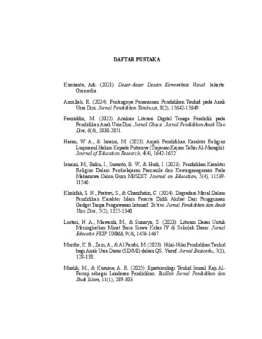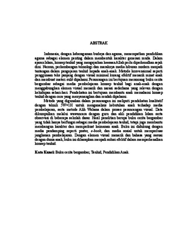 Indonesia, dengan keberagaman budaya dan agama, menempatkan pendidikan agama sebagai elemen penting dalam membentuk karakter generasi muda. Dalam ajaran Islam, konsep tauhid yang mengajarkan keesaan Allah perlu diperkenalkan sejak dini. Namun, perkembangan teknologi dan maraknya media hiburan modern menjadi tantangan dalam pengajaran tauhid kepada anak-anak. Metode konvensional seperti penggunaan teks panjang dengan visual minimal kurang efektif menarik minat anak dan membuat materi sulit dipahami.Perancangan ini bertujuan merancang buku cerita bergambar sebagai media pembelajaran konsep tauhid bagi anak-anak dengan menggabungkan elemen visual menarik dan narasi sederhana yang relevan dengan kehidupan sehari-hari. Pendekatan ini bertujuan membantu anak memahami konsep tauhid dengan cara yang menyenangkan dan mudah dipahami. Metode yang digunakan dalam perancangan ini meliputi pendekatan kualitatif dengan teknik 5W+1H untuk menganalisis kebutuhan anak terhadap media pembelajaran, serta metode Alih Wahana dalam proses perancangan visual. Data dikumpulkan melalui wawancara dengan guru dan ahli pendidikan Islam serta observasi di beberapa sekolah dasar. Hasil penelitian berupa buku cerita bergambar yang tidak hanya berfungsi sebagai media pembelajaran tauhid, tetapi juga membantu membangun karakter dan memperkuat keimanan anak. Buku ini didukung dengan media pendamping seperti poster, e-book, dan media sosial untuk memperluas jangkauan pembelajaran. Dengan elemen visual menarik dan bahasa yang sesuai dengan dunia anak, buku ini diharapkan menjadi solusi efektif dalam memperkenalkan konsep tauhid. Kata Kunci: Buku cerita bergambar, Tauhid, Pendidikan Anak