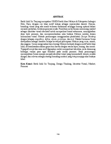 Batik Inhil Sri Tanjung merupakan UMKM batik khas Melayu di Kabupaten Indragiri Hilir, Riau, dengan ciri khas motif kelapa sebagai representasi daerah. Namun, branding visual yang ada masih terkesan tradisional sehingga kurang optimal dalam menarik perhatian, terutama generasi muda. Penelitian ini bertujuan merancang maskot sebagai identitas visual alternatif untuk memperkuat brand awareness, meningkatkan daya tarik promosi, dan merepresentasikan nilai budaya Melayu melalui desain komunikasi visual. Metode perancangan menggunakan pendekatan Design Thinking dengan tahapan empathize, define, ideate, prototype, dan test. Maskot bernama Sirina diwujudkan sebagai karakter kelapa berwujud perempuan Melayu yang ceria, ramah, dan anggun. Sirina mengenakan baju kurung Melayu berhijab dengan motif batik khas Inhil, divisualisasikan dalam gaya semi kartun dengan warna hijau, kuning, dan merah. Tipografi script dan sans serif digunakan untuk memperkuat identitas, serta dirancang berbagai variasi pose agar fleksibel pada media promosi. Hasil perancangan menunjukkan Sirina mampu menjadi identitas visual yang komunikatif, ikonik, mudah diingat, dan relevan sebagai strategi branding modern yang tetap menjaga akar budaya lokal. Kata Kunci: Batik Inhil Sri Tanjung, Design Thinking, Identitas Visual, Maskot, Promosi