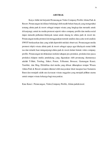 Karya akhir ini berjudul Perancangan Video Company Profile Alinia Park & Resort. Perancangan ini dilatarbelakangi oleh masih belum banyak yang mengetahui tentang Alinia Park & Resort sebagai tempat wisata yang lengkap dan menarik untuk di kunjungi, untuk itu media promosi seperti video company profile dan media sosial dapat menarik perhatian khalayak ramai untuk datang ke Alinia Park & Resort ini. Perancangan media promosi ini menggunakan metode analisis data yaitu teori analisis SWOT berdasarkan data yang telah diperoleh melalui observasi. Perancangan media promosi objek wisata Alinia Park & Resort sebagai upaya agar khalayak ramai lebih tau dan tertarik buat mengunjungi Alinia Park & Resort dalam bentuk video company profile. Perancangan ini dilakukan melalui tahapan pra-produksi, produksi dan pasca produksi. Adapun media pendukung yang digunakan oleh perancang diantaranya adalah T-Shirt, Totebag, Stiker, Poster, X-Banner, Brousur, Gantungan Kunci, Tumbler, dan Mug. Efektivitas dari media yang dibuat diharapkan tempat wisata Alinia Park & Resort semakin dikenal oleh masyarakat lokal maupun luar Sumatera Barat dan menjadi salah satu kawasan wisata unggulan yang menjadi pilihan utama untuk tempat wisata keluarga bagi masyarakat.
