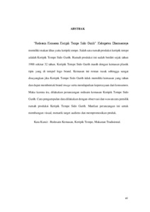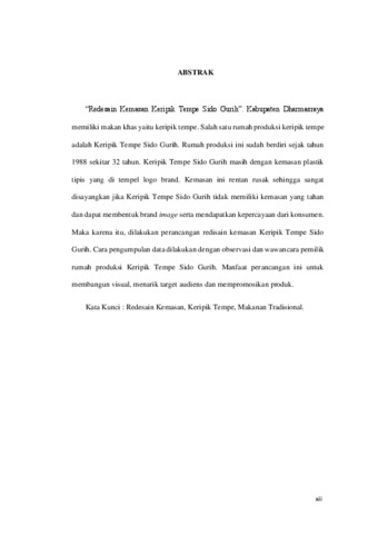 "Redesain Kemasan Keripik Tempe Sido Gurih". Kabupaten Dharmasraya memiliki makan khas yaitu keripik tempe.Salah satu rumah produksi keripik tempe adalah keripik tempe sido gurih. Rumah produksi ini sudah berdiri sejak tahun 1988 ssekitar 32 tahun. Keripik Tempe Sido Gurih masih dengan kemasan plastik tipis yang di tempel logo brand. Kemasan ini rentan rusak sehingga sangat disayangkan jika Keripik Tempe Sido Gurih tidak memiliki kemasan yang tahan dan dapat membentuk brand image serta mendapatkan kepercayaan dari konsumen. Maka karena itu, dilakukan perancangan redisain kemasan keripik tempe sido gurih. Cara pengumpulan data dilakukan dengan observasi dan wawancara pemilik rumah produksi Keripik Tempe Sido Gurih. Manfaat perancangan ini untuk membangun visual, menarik target audiens dan mempromosikan produk.