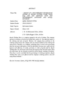 “Toko Baju Aisyah adalah perusahaan yang bergerak dalambidang penjualanbaju. Perusahaan ini menjalankan usahanya dalam bentuk penjualan baju, celana, dll. Salah satu aspek penting adalah di bagian pemesanan barang dan penjualanbarang. Namun perusahaan memiliki masalah dalam sistem pemesanan karenaperusahaan ini masih menggunakan cara manual dalam proses pemesanan barangdan penjualan barang. Untuk itu, dalam sebuah perusahaan teknologi memegangperanan penting dalam mengolah data menjadi informasi yang diperlukansehingga informasi tersebut menjadi lebih bermanfaat dan dapat meningkatkanefisiensi kerja. Pada kenyataanya, pembelian atau pemesanan barang yangdilakukan oleh Toko Baju Aisyah hanya berdasarkan kebutuhan dan permintaandari unit yang memerlukan. Pada waktu-waktu tertentu, pemakaian terhadapbarang melebihi dari persediaan barang, sehingga mengalami kekosongan barang. Dari sini dapat diambil kesimpulan bahwa pembelian atau pemesanan barangpadapenjualan Toko Baju Aisyah belum efisien dan dalam sistem pemesanan barangperusahaan juga masih menggunakan cara manual.” Kata Kunci: Sistem Inventory, EOQ, ROP, PHP, Database MySQL.