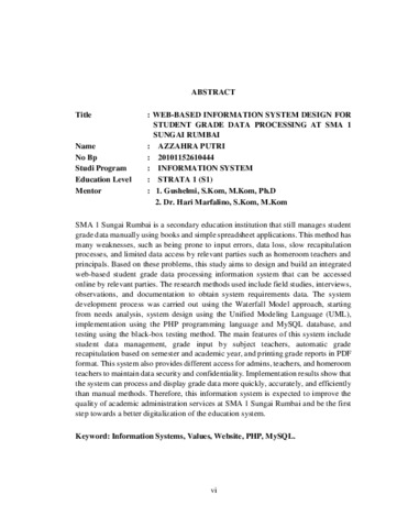 SMA 1 Sungai Rumbai is a secondary education institution that still manages student grade data manually using books and simple spreadsheet applications. This method has many weaknesses, such as being prone to input errors, data loss, slow recapitulation processes, and limited data access by relevant parties such as homeroom teachers and principals. Based on these problems, this study aims to design and build an integrated web-based student grade data processing information system that can be accessed online by relevant parties. The research methods used include field studies, interviews, observations, and documentation to obtain system requirements data. The system development process was carried out using the Waterfall Model approach, starting from needs analysis, system design using the Unified Modeling Language (UML), implementation using the PHP programming language and MySQL database, and testing using the black-box testing method. The main features of this system include student data management, grade input by subject teachers, automatic grade recapitulation based on semester and academic year, and printing grade reports in PDF format. This system also provides different access for admins, teachers, and homeroom teachers to maintain data security and confidentiality. Implementation results show that the system can process and display grade data more quickly, accurately, and efficiently than manual methods. Therefore, this information system is expected to improve the quality of academic administration services at SMA 1 Sungai Rumbai and be the first step towards a better digitalization of the education system. Keyword: Information Systems, Values, Website, PHP, MySQL.