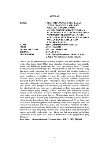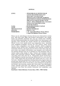 Dimasa saat ini, perkembangan teknologi informasi dan telekomunikasi semakin pesat, tidak hanya dapat dilihat pada peralatan telekomunikasi yang canggih, namun juga kebutuhan pengiriman data yang juga semakin besar. Teknologi informasi adalah pengembangan dari teknolgi komputer dan telekomunikasi yang digunakan untuk mengolah data menjadi informasi dan mendistribusikannya. Metode Teorema Bayes adalah metode yang menggunakan rumus matematika untuk menghitung probabilitas bersyarat dari suatu peristiwa. Dalam metode Teorema Bayes, pengetahuan awal tentang parameter sebelum pengamatan dilakukan disebut distribusi prior. Kemampuan untuk menerima, mengolah, dan mentransfrer informasi yang berguna dari satu lokasi ke lokasi lainya tanpa batas jarak melalui suatu jaringan telekomunikasi yang merupakan suatu karakteristik dari teknologi informasi pada saat era globalisasi ini. Padi merupakan salah satu tanaman pangan paling penting di dunia, Tanaman padi merupakan tanaman pangan utama masyarakat Indonesia. Makanan merupakan kebutuhan manusia yang paling pokok selain udara dan air. Menggunakan metode Teorema Bayes untuk mendiagnosa masalah yang menyerang tanaman padi Oryza Sativa dan Padi indica, terkait dengan hama dan penyakit pada tanaman padi Oryza Sativa dan Padi indica Mendorong pemanfaatan teknologi dalam proses diagnose hama dan penyakit pada tanaman padi Oryza Sativa dan Padi indica. Penelitian ini berhasil mengimplementasikan metode Teorema Bayes untuk mendiagnosis masalah hama dan penyakit yang menyerang tanaman padi. Sistem pakar yang dikembangkan mampu mengolah gejala-gejala yang diinputkan dan menghitung probabilitas kemunculan suatu hama atau penyakit berdasarkan basis pengetahuan yang dibangun. Kata Kunci : Sistem Informasi, Teorema Bayes, SDLC, PHP, MySQL