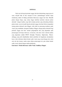 Pada saat ini banyak peternak unggas dan ikan berkembang sangat pesat di suatu wilayah bai di desa maupun di kota. Perkembangan tersebut dapat mendorong umkm dibidang peternakan khususnya unggas dan ikan. Masalah pakan dengan harga yang cukup tinggi membuat peternak mencari pakan alternatif dengan kualitas yang baik terutama protein yang terkandung didalam pakan ternak. Saat ini masih banyak peternak unggas dan ikan belum mengetahui tentang pakan alternatif yaitu manggot. Oleh sebab itu, perancang membuat audio visual yang membahas mengenai budidaya manggot sebagai pakan alternati bagi peternak unggas dan ikan. Metode pengumpulan data yang digunakan pada perancangan ini berupa observasi, wawancara, serta data visual. Metode analisis yang digunakan adalah SWOT (Strenght, Weakness, Opportunity, Threat). Sehingga yang perlu diperhatikan dalam penelitian ini bagaimana menciptakan karya video informasi dalam bentuk audio visual yang sesuai dengan alur cerita serta ide dan konsep. Media utama dalam perancangan ini yaitu dalam bentuk audio visual, serta dengan media pendukung.