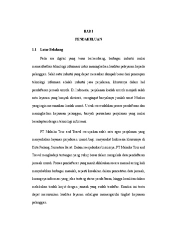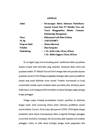 Di era digital yang terus berkembang pesat, transformasi dalam penyediaan layanan menjadi suatu kebutuhan yang mendesak, khususnya dalam sektor jasa perjalanan ibadah. PT Malaika Tour and Travel sebagai salah satu penyedia layanan perjalanan umroh di Kota Padang menghadapi tantangan dalam proses pendaftaran jamaah yang masih dilakukan secara manual. Prosedur konvensional ini kerap menimbulkan kendala seperti kesalahan dalam pencatatan data, lambatnya proses tindak lanjut, serta kurangnya efektivitas dalam membina hubungan jangka panjang dengan pelanggan. Sebagai respon terhadap permasalahan tersebut, penelitian ini dilakukan dengan tujuan untuk merancang sebuah sistem informasi pendaftaran jamaah umroh berbasis Customer Relationship Management (CRM). CRM dipilih sebagai pendekatan utama karena kemampuannya dalam mengelola hubungan pelanggan secara lebih terstruktur, terintegrasi, dan berorientasi pada kepuasan serta loyalitas pelanggan. Sistem ini tidak hanya berfungsi sebagai media pengelolaan data vi pendaftaran, tetapi juga sebagai sarana komunikasi dua arah yang mendukung pengambilan keputusan yang lebih cepat dan akurat. Dalam penelitian ini, metode pengembangan yang digunakan mencakup tahap pengumpulan data lapangan, analisis terhadap sistem yang berjalan, perancangan model sistem menggunakan Unified Modeling Language (UML), hingga tahap implementasi menggunakan bahasa pemrograman PHP dan database MySQL. Sistem yang dirancang juga dilengkapi dengan fitur reward sebagai bentuk apresiasi kepada jamaah, yang diharapkan mampu mendorong pelanggan untuk tetap setia menggunakan layanan perusahaan. Hasil dari penelitian ini menunjukkan bahwa penerapan sistem informasi berbasis CRM dapat memberikan solusi yang efektif dan efisien dalam proses pendaftaran jamaah. Tidak hanya meningkatkan keakuratan data dan kecepatan pelayanan, sistem ini juga memperkuat ikatan emosional antara perusahaan dan pelanggan melalui pendekatan yang lebih personal. Dengan demikian, sistem ini diharapkan dapat memberikan kontribusi nyata terhadap peningkatan mutu layanan PT Malaika Tour and Travel dalam jangka panjang. Kata kunci: Sistem Informasi, Pendaftaran Umroh, Customer Relationship Management (CRM), Loyalitas Pelanggan.