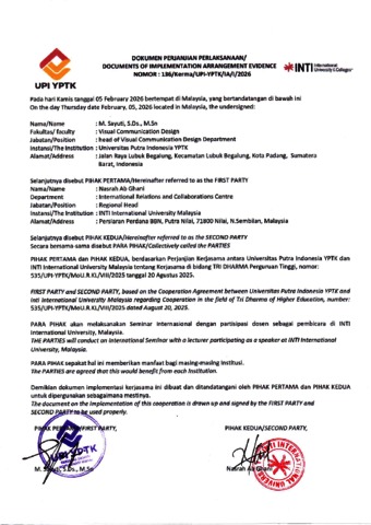 Biro, Kerjasama (2026) Implementation Arrangement antara Prodi Desain Komunikasi Visual Universitas Putra Indonesia YPTK dan INTI International University Malaysia tentang Kerjasama di bidang TRI DHARMA Perguruan Tinggi. Biro Kerjasama UPI YPTK. (Unpublished)