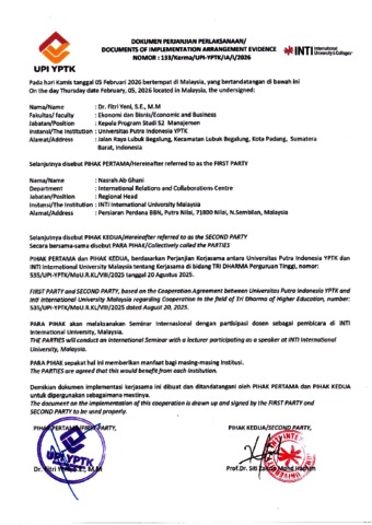 Biro, Kerjasama (2026) Implementation Arrangement antara Prodi S2 Manajemen Universitas Putra Indonesia YPTK dan INTI International University Malaysia tentang Kerjasama di bidang TRI DHARMA Perguruan Tinggi. Biro Kerjasama UPI YPTK. (Unpublished)