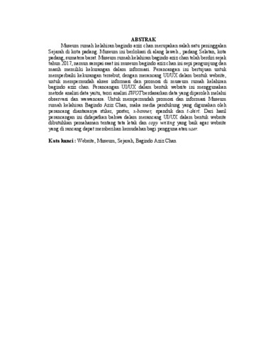 Museum rumah kelahiran bagindo aziz chan merupakan salah satu peninggalan Sejarah di kota padang. Museum ini berlokasi di alang laweh , padang Selatan, kota padang, sumatera barat. Museum rumah kelahiran bagindo aziz chan telah berdiri sejak tahun 2017, namun sampai saat ini museum bagindo aziz chan ini sepi pengunjung dan masih memiliki kekurangan dalam informasi. Perancangan ini bertujuan untuk memperbaiki kekurangan tersebut, dengan merancang UI/UX dalam bentuk website, untuk mempermudah akses informasi dan promosi di museum rumah kelahiran bagindo aziz chan. Perancangan UI/UX dalam bentuk website ini menggunakan metode analisi data yaitu, teori analisi SWOT berdasarkan data yang diperoleh melalui observasi dan wawancara. Untuk mempermudah promosi dan informasi Museum rumah kelahiran Bagindo Aziz Chan, maka media pendukung yang digunakan oleh perancang diantaranya stiker, poster, x-banner, spanduk dan t-shirt. Dari hasil perancangan ini didapatkan bahwa dalam merancang UI/UX dalam bentuk website dibutuhkan pemahaman tentang tata letak dan copy writing yang baik agar website yang di rancang dapat memberikan kemudahan bagi pengguna atau user.