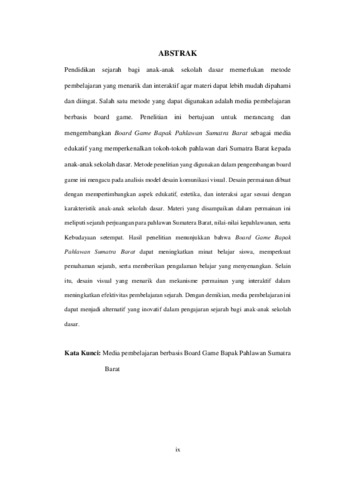 Pendidikan sejarah bagi anak-anak sekolah dasar memerlukan metode pembelajaran yang menarik dan interaktif agar materi dapat lebih mudah dipahami dan diingat. Salah satu metode yang dapat digunakan adalah media pembelajaran berbasis board game. Penelitian ini bertujuan untuk merancang dan mengembangkan Board Game Bapak Pahlawan Sumatra Barat sebagai media edukatif yang memperkenalkan tokoh-tokoh pahlawan dari Sumatra Barat kepada anak-anak sekolah dasar. Metode penelitian yang digunakan dalam pengembangan board game ini mengacu pada analisis model desain komunikasi visual. Desain permainan dibuat dengan mempertimbangkan aspek edukatif, estetika, dan interaksi agar sesuai dengan karakteristik anak-anak sekolah dasar. Materi yang disampaikan dalam permainan ini meliputi sejarah perjuangan para pahlawan Sumatera Barat, nilai-nilai kepahlawanan, serta Kebudayaan setempat. Hasil penelitian menunjukkan bahwa Board Game Bapak Pahlawan Sumatra Barat dapat meningkatkan minat belajar siswa, memperkuat pemahaman sejarah, serta memberikan pengalaman belajar yang menyenangkan. Selain itu, desain visual yang menarik dan mekanisme permainan yang interaktif dalam meningkatkan efektivitas pembelajaran sejarah. Dengan demikian, media pembelajaran ini dapat menjadi alternatif yang inovatif dalam pengajaran sejarah bagi anak-anak sekolah dasar.
