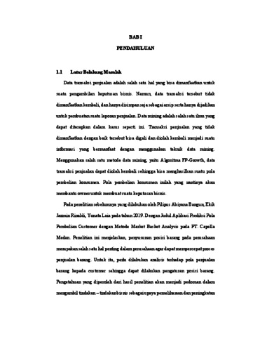 Data transaksi penjualan adalah salah satu hal yang bisa dimanfaatkan untuk suatu pengambilan keputusan bisnis. Data transaksi yang dimanfaatkan dengan baik dapat digunakan kembali menjadi suatu informasi yang berguna bagi bisnis. Pada Toko Aura Moms Baby & Kids tidak adanya pemanfaatan dan pengolahan data transaksi yang lebih lanjut membuat pihak toko tidak mengetahui produk yang sering dibeli oleh para pelanggan. Dengan banyaknya konsumen pada toko dan membeli produk yang sangat beragam terdapat kesulitan untuk menentukan pola pembelian produk. Jadi, diperlukannya solusi untuk mengetahui pola pembelian produk tersebut, sehinggan toko dapat mengatur produk yang sering dibeli secara bersamaan. Oleh sebab itu Pendekatan dengan data mining dinilai cocok untuk menemukan pola pembelian produk yang dibeli secara bersamaan oleh pelanggan. Data transaksi penjualan akan dianalisis kembali untuk mendapatkan pola pembelian produk, sekaligus membantu dalam tata letak produk dan pengadaan stok produk. Pola pembelian produk yang dihasilkan dari 45 transaksi pada bulan Februari sebanyak 5 interesting rules. Dengan nilai minimum support yaitu 10% dan minimum confidence yaitu 50% didapatkannya pola yaitu jika membeli baju maka juga akan membeli popok atau membeli celana, dot baby, topi, atau singlet. Algoritma yang digunakan untuk membantu toko dalam menemukan pola pembelian produk adalah Algoritma FP-Growth. Algoritma FP-Growth merupakan metode yang dapat mengolah data transaksi dengan lebih cepat dan akurat dalam merancang sistem yang digunakan untuk menganalisis pola pembelian produk dengan menggunakan data transaksi penjualan. Hasil pada penelitian ini dapat membantu toko dalam menentukan pola pembelian produk, mengatur tata letak produk serta mengetahui stok produk pada Toko Aura Moms Baby & Kids.