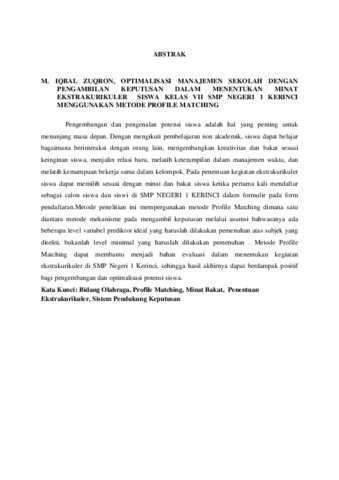 Pengembangan dan pengenalan potensi siswa adalah hal yang penting untuk menunjang masa depan. Dengan mengikuti pembelajaran non akademik, siswa dapat belajar bagaimana berinteraksi dengan orang lain, mengembangkan kreativitas dan bakat sesuai keinginan siswa, menjalin relasi baru, melatih keterampilan dalam manajemen waktu, dan melatih kemampuan bekerja sama dalam kelompok. Pada penentuan kegiatan ekstrakurikuler siswa dapat memilih sesuai dengan minat dan bakat siswa ketika pertama kali mendaftar sebagai calon siswa dan siswi di SMP NEGERI 1 KERINCI dalam formulir pada form pendaftaran.Metode penelitian ini mempergunakan metode Profile Matching dimana satu diantara metode mekanisme pada mengambil keputusan melalui asumsi bahwasanya ada beberapa level variabel prediktor ideal yang haruslah dilakukan pemenuhan atas subjek yang diteliti, bukanlah level minimal yang haruslah dilakukan pemenuhan . Metode Profile Matching dapat membantu menjadi bahan evaluasi dalam menentukan kegiatan ekstrakurikuler di SMP Negeri 1 Kerinci, sehingga hasil akhirnya dapat berdampak positif bagi pengembangan dan optimalisasi potensi siswa.