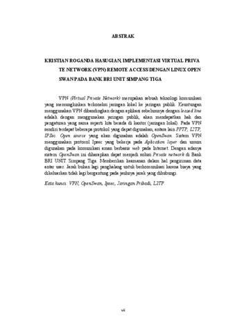 VPN (Virtual Private Network) merupakan sebuah teknologi komunikasi yang memungkinkan terkoneksi jaringan lokal ke jaringan publik. Keuntungan menggunakan VPN dibandingkan dengan aplikasi sebelumnya dengan leased line adalah dengan menggunakan jaringan publik, akan mendapatkan hak dan pengaturan yang sama seperti kita berada di kantor (jaringan lokal). Pada VPN sendiri terdapat beberapa protokol yang dapat digunakan, antara lain PPTP, L2TP, IPSec. Open source yang akan digunakan adalah OpenSwan. Sistem VPN menggunakan protocol Ipsec yang bekerja pada Aplication layer dan umum digunakan pada komunikasi aman berbasis web pada Internet. Dengan adanya sistem OpenSwan ini diharapkan dapat menjadi solusi Private network di Bank BRI UNIT Simpang Tiga. Memberikan keamanan dalam hal pengiriman data antar user. Jarak bukan lagi penghalang untuk berkomunikasi karena biaya yang dikeluarkan tidak lagi bergantung pada jauhnya jarak yang dihubungi.