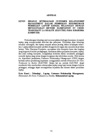 Perkembangan teknologi saat ini menciptakan berbagai kemajuan, termasuk laptop yang mempermudah aktivitas dan pekerjaan. Kebutuhan akan teknologi semakin meningkat, dan laptop menjadi sarana penting dalam kehidupan sehari- hari. Laptop adalah komputer portable dengan berat ringan dan memiliki daya tahan baterai. Toko Kharisma Komputer, merupakan toko komputer besar dan lengkap yang bergerak di sektor perdagangan, khususnya dalam penjualan komputer, laptop, dan suku cadang komputer, menghadapi kesulitan dalam membantu pelanggan memilih laptop yang sesuai dengan keinginan dan kebutuhan mereka. Oleh karena itu, diperlukan pendekatan Customer Relationship Management (CRM) dengan bantuan sistem pendukung keputusan menggunakan metode Elimination Et Choix Traduisant La Realite (ELECTRE). Dalam hal ini, metode ELECTRE dapat membantu toko memberikan rekomendasi laptop yang tepat sesuai dengan kriteria pelanggan, sehingga dapat meningkatkan kepuasan dan akurasi dalam pemilihan laptop.