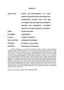 Usaha Sulaman Bayangan merupakan salah satu bentuk usaha kerajinan tradisional yang berkembang di Barung-Barung Balantai, Kabupaten Pesisir Selatan. Dalam pengelolaannya, sistem penjualan dan pemasaran yang digunakan masih bersifat konvensional, serta belum didukung oleh sistem manajemen pelanggan yang terstruktur. Penelitian ini bertujuan untuk merancang dan membangun sistem informasi penjualan dan pemasaran terintegrasi berbasis web dengan penerapan metode Customer Relationship Management (CRM) guna mengoptimalkan layanan pelanggan. Metode pengembangan sistem yang digunakan adalah pendekatan Waterfall yang terdiri dari tahapan analisis, perancangan, implementasi, pengujian, dan evaluasi. Sistem ini dibangun menggunakan bahasa pemrograman PHP dan database MySQL, dengan fitur utama berupa manajemen data pelanggan, transaksi online, status pesanan, rating dan komentar, serta komunikasi melalui live chat. Hasil implementasi menunjukkan bahwa sistem ini dapat mempermudah proses penjualan, memperluas jangkauan pemasaran, serta meningkatkan hubungan dan kepuasan pelanggan melalui pelayanan yang lebih responsif dan terstruktur. Sistem ini diharapkan mampu menjadi solusi digital yang relevan bagi pengembangan usaha tradisional berbasis kerajinan di era modern Kata kunci: Sistem Informasi, Penjualan, Pemasaran, CRM