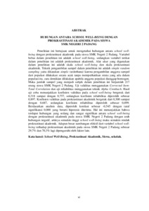 Penelitian ini bertujuan untuk mengetahui hubungan antara school well�being dengan prokrastinasi akademik pada siswa SMK Negeri 2 Padang. Variabel bebas dalam penelitian ini adalah school well-being, sedangkan variabel terikat dalam penelitian ini adalah prokrastinasi akademik. Alat ukur yang digunakan dalam penelitian ini adalah skala school well-being dan skala prokrastinasi akademik. Teknik pengambilan sampel dalam penelitian ini adalah simple random sampling yaitu dikatakan simple (sederhana) karena pengambilan anggota sampel dari populasi dilakukan secara acak tanpa memperhatikan strata yang ada dalam populasi itu, cara demikian dilakukan apabila anggota populasi dianggap homogen. Maka jumlah sampel yang menjadi subjek dalam penelitian ini berjumlah 217 orang siswa SMK Negeri 2 Padang. Uji validitas menggunakan Corrected Item�Total Correlation dan uji reliabilitas menggunakan teknik Alpha Cronbach. Hasil uji coba menunjukkan koefisien validitas pada school well-being bergerak dari 0,318 sampai dengan 0,757, sedangkan koefisien reliabilitas diperoleh sebesar 0,897. Koefisien validitas pada prokrastinasi akademik bergerak dari 0,300 sampai dengan 0,687, sedangkan koefisien reliabilitas diperoleh sebesar 0,899. Berdasarkan analisis data, diperoleh korelasi sebesar -0,545 dengan taraf signifikansi 0,000 yang berarti hipotesis diterima. Hal ini menunjukkan bahwa terdapat hubungan yang sedang dan sangat signifikan antara school well-being dengan prokrastinasi akademik pada siswa SMK Negeri 2 Padang dengan arah hubungan negatif, artinya semakin tinggi school well-being maka semakin rendah prokrastinasi akademik. Adapun besar sumbangan efektif dari variabel school well�being terhadap prokrastinasi akademik pada siswa SMK Negeri 2 Padang sebesar 29,7% dan 70,3% lagi dipengaruhi oleh faktor lain.