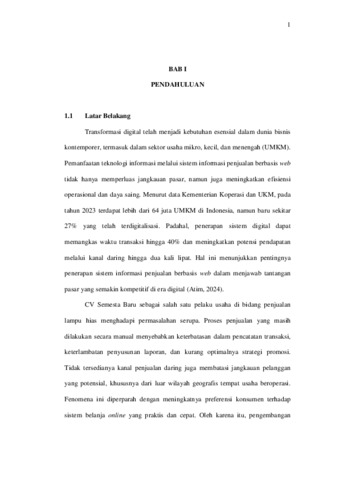 Penelitian ini bertujuan untuk merancang sistem informasi penjualan lampu hias pada CV Semesta Baru berbasis web menggunakan bahasa pemrograman PHP dan database MySQL. Sistem ini dikembangkan untuk mengatasi permasalahan yang sering terjadi dalam proses penjualan manual, seperti keterlambatan pencatatan transaksi, kesalahan input data, dan kesulitan dalam memantau stok barang. Dengan adanya sistem informasi ini, proses pengelolaan data penjualan, pelanggan, dan laporan dapat dilakukan secara lebih terstruktur dan efisien. Metode pengembangan yang digunakan adalah model Waterfall yang meliputi tahap analisis kebutuhan, desain sistem, implementasi, dan pengujian. Sistem yang dirancang menyediakan fitur manajemen produk, pemesanan online, pencatatan transaksi otomatis, laporan penjualan, serta pengelolaan stok barang secara real-time. Hasil pengujian menunjukkan bahwa sistem mampu meningkatkan kecepatan dan ketepatan dalam proses transaksi, meminimalisasi kesalahan pencatatan, serta membantu manajemen dalam mengambil keputusan berdasarkan laporan yang dihasilkan. Penggunaan PHP dan MySQL dipilih karena keduanya memiliki fleksibilitas tinggi, mudah diimplementasikan, serta dapat menangani kebutuhan pengolahan data yang cukup besar. Dengan sistem informasi berbasis web ini, diharapkan CV Semesta Baru dapat memberikan pelayanan yang lebih optimal kepada pelanggan dan meningkatkan kinerja operasional perusahaan. Kata kunci : Sistem Informasi, Penjualan, PHP, MySQL