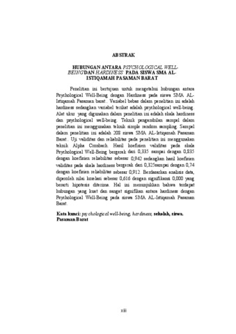 Penelitian ini bertujuan untuk mengetahui hubungan antara Psychological Well-Being dengan Hardiness pada siswa SMA AL-Istiqamah Pasaman barat.. Variabel bebas dalam penelitian ini adalah hardiness sedangkan variabel terikat adalah psychological well-being. Alat ukur yang digunakan dalam penelitian ini adalah skala hardiness dan psychological well-being. Teknik pengambilan sampel dalam penelitian ini menggunakan teknik simple random sampling. Sampel dalam penelitian ini adalah 208 siswa SMA AL-Istiqamah Pasaman Barat.. Uji validitas dan reliabilitas pada penelitian ini menggunakan teknik Alpha Cronbach. Hasil koefisien validitas pada skala Psychological Well-Being bergerak dari 0,335 sampai dengan 0,835 dengan koefisien reliabilitas sebesar 0,942 sedangkan hasil koefisien validitas pada skala hardiness bergerak dari 0,325sampai dengan 0,74 dengan koefisien reliabilitas sebesar 0,912. Berdasarkan analisis data, diperoleh nilai korelasi sebesar 0,616 dengan signifikansi 0,000 yang berarti hipotesis diterima. Hal ini menunjukkan bahwa terdapat hubungan yang kuat dan sangat signifikan antara hardiness dengan Psychological Well-Being pada siswa SMA AL-Istiqamah Pasaman Barat.