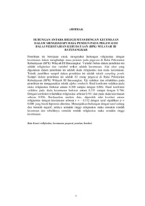 Penelitian ini bertujuan untuk mengetahui hubungan religiusitas dengan kecemasan dalam menghadapi masa pensiun pada pegawai di Balai Pelestarian Kebudayaan (BPK) Wilayah III Batusangkar. Variabel bebas dalam penelitian ini adalah religiusitas dan variabel terikat adalah kecemasan. Alat ukur yang digunakan dalam penelitian ini adalah skala religiusitas dan skala kecemasan. Teknik pemilihan sampel dalam penelitian ini adalah teknik sampling jenuh. Sampel dalam penelitian ini adalah 63 orang pegawai di Balai Pelestarian Kebudayaan (BPK) Wilayah III Batusangkar. Uji validitas dan reliabilitas pada penelitian ini menggunakan teknik alpha cronbach. Hasil koefesien validitas pada skala religiusitas berkisar antara 0.300 sampai dengan 0,802. Hasil koefesien validitas pada skala kecemasan berkisar antara 0.331 sampai dengan 0.766. Dengan koefesien reliabilitas religiusitas sebesar 0.911 dan pada skala kecemasan sebesar 0.936. Berdasarkan analisis data, diperoleh nilai korelasi antara religiusitas dengan kecemasan sebesar r = - 0.532 dengan taraf signifikan p = 0.000 yang bearti hipotesis diterima. Menunjukkan hubungan dengan taraf sedang dan berarah negatif, artinya semakin tinggi religiusitas maka semakin rendah kecemsan dan sebaliknya semakin rendah religiusitas maka semakin tinggi kecemasan.