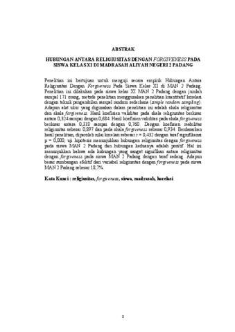 Penelitian ini bertujuan untuk menguji secara empirik Hubungan Antara Religiusitas Dengan Forgiveness Pada Siswa Kelas XI di MAN 2 Padang. Penelitian ini dilakukan pada siswa kelas XI MAN 2 Padang dengan jumlah sampel 171 orang, metode penelitian menggunakan penelitian kuantitatif korelasi dengan teknik pengambilan sampel random sederhana (simple random sampling). Adapun alat ukur yang digunakan dalam penelitian ini adalah skala religiusitas dan skala forgiveness. Hasil koefisien validitas pada skala religiusitas berkisar antara 0,324 sampai dengan 0,684. Hasil koefisien validitas pada skala forgiveness berkisar antara 0,318 sampai dengan 0,760. Dengan koefisien reabilitas religiusitas sebesar 0,897 dan pada skala forgiveness sebesar 0,934. Berdasarkan hasil penelitian, diperoleh nilai korelasi sebesar r = 0,432 dengan taraf signifikansi p = 0,000, uji hipotesis menunjukkan hubungan religiusitas dengan forgiveness pada siswa MAN 2 Padang dan hubungan keduanya adalah positif. Hal ini menunjukkan bahwa ada hubungan yang sangat signifikan antara religiusitas dengan forgiveness pada siswa MAN 2 Padang dengan taraf sedang. Adapun besar sumbangan efektif dari variabel religiusitas dengan forgiveness pada siswa MAN 2 Padang sebesar 18,7%.