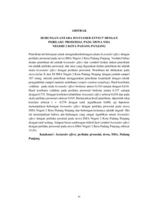 Penelitian ini bertujuan untuk mengetahui hubungan antara bystander effect dengan perilaku prososial pada siswa SMA Negeri 2 Kota Padang Panjang. Variabel bebas dalam penelitian ini adalah bystander effect dan variabel terikat dalam penelitian ini adalah perilaku prososial, alat ukur yang digunakan dalam penelitian ini adalah skala bystander effect dengan perilaku prososial. Penelitian ini dilakukan pada siswa kelas X dan XI SMA Negeri 2 Kota Padang Panjang dengan jumlah sampel 187 orang, metode penelitian menggunakan penelitian kuantitatif dengan teknik pengambilan sampel random sederhana (simple random sampling). Hasil koefisien validitas pada skala bystander effect berkisar antara 0,310 sampai dengan 0,618.Hasil koefisien validitas pada perilaku prososial berkisar antara 0,337 sampai dengan 0,735. Dengan koefisien reliabilitas bystander effect sebesar 0,838 dan pada skala perilaku prososial sebesar 0,910. Berdasarkan hasil penelitian, diperoleh nilai korelasi sebesar r = -0,578 dengan taraf signifikansi 0,000, uji hipotesis menunjukkan hubungan bystander effect dengan perilaku prososial pada siswa SMA Negeri 2 Kota Padang Panjang dan hubungan keduanya adalah negatif. Hal ini menunjukkan bahwa ada hubungan yang sangat signifikan antara bystander effect dengan perilaku prosisal pada siswa SMA Negeri 2 Kota Padang Panjang dengan taraf sedang. Adapun besar sumbangan efektif dari variabel bystander effect dengan perilaku prososial pada siswa SMA Negeri 2 Kota Padang Panjang sebesar 33,4%.