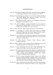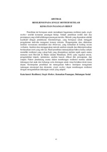 Penelitian ini bertujuan untuk memahami bagaimana resiliensi pada single mother setelah kematian pasangan hidup. Subjek penelitian terdiri dari dua perempuan yang telah kehilangan pasangan mereka. Metode yang digunakan adalah kualitatif dengan pendekatan fenomenologis, yang bertujuan untuk menggali pengalaman individu mengenai konsep tertentu. Pengumpulan data dilakukan melalui wawancara mendalam dan observasi, yang kemudian di koding secara verbatim. Analisis data menggunakan metode analisis tematik dan diinterpretasikan berdasarkan teori yang relevan. Hasil penelitian menunjukkan bahwa kedua subjek memiliki resiliensi yang cukup baik yang ditunjukkan melalui tujuh aspek utama menurut teori Reivich & Shatte (dalam Hendriani, 2018) yaitu regulasi emosi, pengendalian impuls, optimisme, analisis kausal, efikasi diri, pencapaian, dan empati. Faktor pendukung utama dalam membangun resiliensi mereka adalah dukungan dari anak dan keluarga serta dorongan untuk tetap bertahan demi masa depan. Kesimpulan penelitian ini menegaskan bahwa meskipun mengalami tantangan emosional dan ekonomi, single mother dapat membangun resiliensi dengan mengandalkan dukungan sosial yang adaptif.
