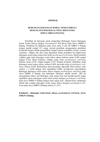 Penelitian ini bertujuan untuk mengetahui Hubungan Antara Dukungan Sosial Teman Sebaya Dengan Psychological Well-Being Pada Siswa SMKN 6 Padang. Penelitian ini dilakukan pada siswa kelas X dan XI SMKN 6 Padang dengan jumlah sampel 213 orang, metode penelitian menggunakan penelitian kuantitatif dengan teknik pengambilan sampel random sederhana (simple random sampling). Adapun alat ukur yang digunakan dalam penelitian ini adalah skala dukungan sosial teman sebaya dan skala psychological well-being. Hasil koefisien validitas pada skala dukungan sosial teman sebaya berkisar antara 0,308 sampai dengan 0,782. Hasil koefisien validitas pada skala psychological well-being berkisar antara 0,301 sampai dengan 0,745. Dengan koefisien reliabilitas skala dukungan sosial teman sebaya sebesar 0,894 dan pada skala psychological well�being sebesar 0,928. Berdasarkan hasil penelitian, diperoleh nilai korelasi yaitu sebesar r = 0,844 dengan taraf signifikansi 0,000, uji hipotesis menunjukkan hubungan dukungan sosial teman sebaya dengan psychological well-being pada siswa SMKN 6 Padang dan hubungan keduanya adalah positif.. Hal ini menunjukkan bahwa ada hubungan yang sangat kuat dan berarah positif sangat signifikan antara dukungan sosial teman sebaya dengan psychologicsl well-being pada siswa SMKN 6 Padang dengan taraf sangat kuat. Adapun besar sumbangan efektif dari variabel dukungan sosial teman sebaya dengan psychological well�being pada siswa SMKN 6 Padang sebesar 71,23%.