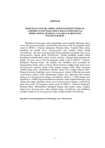 Penelitian ini bertujuan untuk mengetahui secara empirik hubungan antara moral disengagement dengan cyberbullying pada siswa kelas XI pengguna media sosial di SMAN 1 Talamau Kabupaten Pasaman Barat. Variabel bebas dalam penelitian ini adalah moral disengagement dan variabel terikat adalah cyberbullying. Alat ukur yang digunakan dalam penelitian ini adalah skala moral disengagement dengan skala cyberbullying. Teknik pemilihan sampel dalam penelitian ini adalah teknik simple random sampling . Sampel dalam penelitian ini adalah 122 siswa siswa kelas XI pengguna media sosial di SMAN 1 Talamau Kabupaten Pasaman Barat. Uji validitas dan reliabilitas pada penelitian ini menggunakan teknik alpha cronbach. Hasil koefesien validitas pada skala moral disengagement berkisar antara 0,300 sampai dengan 0,802. Hasil koefesien validitas pada skala cyberbullying berkisar antara 0,334 sampai dengan 0,893. Dengan koefesien reliabilitas moral disengagement sebesar 0.906 dan pada skala cyberbullying sebesar 0.956. Berdasarkan analisis data, diperoleh nilai korelasi antara moral disengagement dengan cyberbullying sebesar r = 0,469 dengan taraf signifikan p = 0.000 yang berarti hipotesis diterima, maka terdapat hubungan yang sedang dan sangat signifikan antara moral disengagement dengan cyberbullying pada siswa kelas XI pengguna media sosial di SMAN 1 Talamau Kabupaten Pasaman Barat. Menunjukkan hubungan dengan arah positif, artinya semakin tinggi moral disengagement maka semakin tinggi cyberbullying, dan sebaliknya semakin rendah moral disengagement maka semakin rendah cyberbullying.
