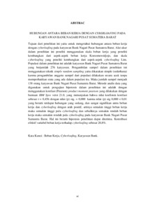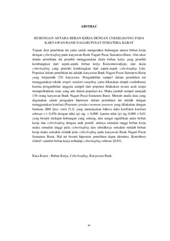 Tujuan dari penelitian ini yaitu untuk mengetahui hubungan antara beban kerja dengan cyberloafing pada karyawan Bank Nagari Pusat Sumatera Barat. Alat ukur dalam penelitian ini peneliti menggunakan skala beban kerja yang peneliti kembangkan dari aspek-aspek beban kerja Koesomowidjojo, dan skala cyberloafing yang peneliti kembangkan dari aspek-aspek cyberloafing Lim. Populasi dalam penelitian ini adalah karyawan Bank Nagari Pusat Sumatera Barat yang berjumlah 276 karyawan. Pengambilan sampel dalam penelitian ini menggunakan teknik simple random sampling yaitu dikatakan simple (sederhana) karena pengambilan anggota sampel dari populasi dilakukan secara acak tanpa memperhatikan srata yang ada dalam populasi itu. Maka jumlah sampel menjadi 138 orang karyawan Bank Nagari Pusat Sumatera Barat. Metode analis data yang digunakan untuk pengujian hipotesis dalam penelitian ini adalah dengan menggunakan korelasi (Pearson) product moment pearson yang dilakukan dengan bantuan IBM Spss versi 21.0, yang menunjukan bahwa nilai koefisien korelasi sebesar r = 0,456 dengan nilai (p) sig. = 0,000 karena nilai (p) sig 0,000 < 0,01 yang berarti terdapat hubungan yang sedang, dan sangat signifikan antra beban kerja dan cyberloafing dengan arah positif, artinya semakin tinggi beban kerja maka semakin tinggi pula cyberloafing dan sebaliknya semakin rendah beban kerja maka semakin rendah pula cyberloafing pada karyawan Bank Nagari Pusat Sumatera Barat. Hal ini berarti hipotesis penelitian dapat diterima. Kontribusi efektif variabel beban kerja terhadap cyberloafing sebesar 20,8%.