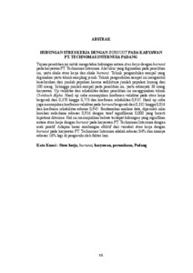 Tujuan penelitian ini untuk mengetahui hubungan antara stres kerja dengan burnout pada karyawan PT. Technomas Internusa. Alat ukur yang digunakan pada penelitian ini, yaitu skala stres kerja dan skala burnout. Teknik pengambilan sampel yang digunakan yaitu teknik sampling jenuh. Teknik pengambilan sampel ini mengambil keseluruhan dari jumlah populasi karena sedikitnya jumlah populasi kurang dari 100 orang. Sehingga jumlah sampel pada penelitian ini, yaitu sebanyak 38 orang karyawan. Uji validitas dan reliabilitas dalam penelitian ini menggunakan teknik Cronbach Alpha. Hasil uji coba menunjukan koefesien validitas pada stres kerja bergerak dari 0,370 hingga 0,773 dan koefesien reliabilitas 0,935. Hasil uji coba juga menunjukan koefesien validitas pada burnout bergerak dari 0,332 hingga 0,816 dan koefesien reliabilitas sebesar 0,945. Berdasarkan analisis data, diperoleh nilai korelasi sederhana sebesar 0,916 dengan taraf signifikansi 0,000 yang berarti hipotesis diterima. Hal ini menunjukkan bahwa terdapat hubungan yang signifikan antara stres kerja dengan burnout pada karyawan PT. Technomas Internusa dengan arah positif. Adapun besar sumbangan efektif dari variabel stres kerja dengan burnout pada karyawan PT. Technomas Internusa adalah sebesar 84% dan sisanya sebesar 16% lagi di pengaruhi oleh faktor lain.