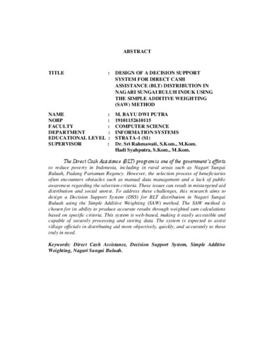 Program Bantuan Langsung Tunai (BLT) merupakan salah satu upaya pemerintah dalam mengurangi angka kemiskinan di Indonesia, termasuk di wilayah pedesaan seperti Nagari Sungai Buluah, Kabupaten Padang Pariaman. Namun, proses penetapan penerima bantuan di lapangan sering menghadapi berbagai kendala, seperti pengelolaan data yang masih manual dan kurangnya sosialisasi mengenai kriteria penerima bantuan. Hal ini dapat menyebabkan bantuan tidak tepat sasaran dan menimbulkan konflik sosial di masyarakat. Untuk mengatasi permasalahan tersebut, penelitian ini bertujuan merancang sebuah Sistem Penunjang Keputusan (SPK) dalam penerimaan BLT di Nagari Sungai Buluah dengan menerapkan metode Simple Additive Weighting (SAW). Metode SAW dipilih karena mampu memberikan hasil keputusan yang lebih akurat melalui perhitungan penjumlahan terbobot berdasarkan kriteria-kriteria tertentu. Sistem ini dibangun berbasis web agar mudah diakses oleh pengguna dan mampu menyimpan serta mengolah data dengan aman dan efisien. Dengan adanya sistem ini, diharapkan proses penyaluran bantuan dapat dilakukan secara lebih objektif, cepat, dan tepat sasaran. Kata kunci: Bantuan Langsung Tunai, Sistem Penunjang Keputusan, Simple Additive Weighting, Nagari Sungai Buluah.a