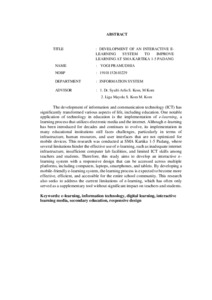 Perkembangan teknologi informasi dan komunikasi (TIK) telah membawa perubahan signifikan dalam berbagai aspek kehidupan, termasuk dalam dunia pendidikan. Salah satu bentuk pemanfaatan teknologi dalam pendidikan adalah penerapan e-learning, yaitu proses pembelajaran berbasis media elektronik dan jaringan internet. Meskipun e-learning sudah diperkenalkan sejak lama dan terus berkembang, penerapannya di sejumlah institusi pendidikan masih menghadapi kendala, terutama terkait dengan infrastruktur, sumber daya manusia, dan tampilan antarmuka pengguna yang kurang responsif terhadap perangkat mobile.Penelitian ini dilakukan di SMA Kartika 1-5 Padang yang menghadapi berbagai keterbatasan dalam penerapan e-learning, seperti infrastruktur internet yang belum memadai, keterbatasan laboratorium komputer, serta rendahnya keterampilan TIK guru dan siswa. Oleh karena itu, penelitian ini bertujuan untuk mengembangkan sistem e-learning interaktif yang mendukung tampilan responsif sehingga dapat diakses melalui berbagai perangkat seperti komputer, laptop, smartphone, dan tablet. Dengan pengembangan sistem e-learning berbasis mobile-friendly ini, diharapkan proses pembelajaran menjadi lebih efektif, efisien, dan dapat diakses dengan mudah oleh seluruh warga sekolah. Penelitian ini juga berupaya memberikan solusi terhadap keterbatasan penggunaan e-learning yang selama ini hanya berfungsi sebagai suplemen pembelajaran tanpa memberikan dampak signifikan bagi guru dan siswa. Kata Kunci: e-learning, teknologi informasi, pembelajaran digital, media pembelajaran interaktif, pendidikan menengah, tampilan responsive.