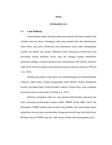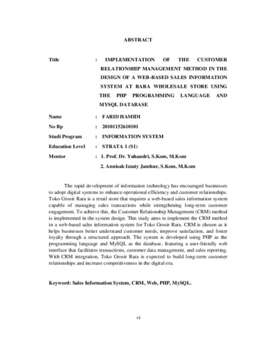 Perkembangan teknologi informasi yang pesat mendorong para pelaku usaha untuk memanfaatkan sistem berbasis digital guna meningkatkan efisiensi operasional dan hubungan dengan pelanggan. Toko Grosir Rara merupakan salah satu usaha yang membutuhkan sistem informasi penjualan berbasis web yang mampu mengelola transaksi penjualan serta membangun hubungan yang lebih baik dengan pelanggan secara berkelanjutan. Untuk mencapai tujuan tersebut, diterapkan metode Customer Relationship Management (CRM) dalam perancangan sistem informasi. Penelitian ini bertujuan untuk mengimplementasikan metode CRM dalam sistem informasi penjualan berbasis web pada Toko Grosir Rara. CRM dipilih karena mampu membantu perusahaan dalam memahami kebutuhan pelanggan, meningkatkan kepuasan, serta mendorong loyalitas pelanggan melalui pendekatan yang terstruktur. Sistem dirancang menggunakan bahasa pemrograman PHP dan database MySQL dengan antarmuka yang user-friendly, sehingga memudahkan pengguna dalam melakukan transaksi, pengelolaan data pelanggan, dan pembuatan laporan penjualan. Dengan penerapan CRM, Toko Grosir Rara diharapkan dapat menjalin hubungan jangka panjang dengan pelanggan dan meningkatkan daya saing di era digital. Kata Kunci: Sistem Informasi Penjualan, CRM, Web, PHP, MySQL.