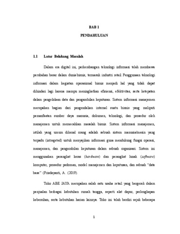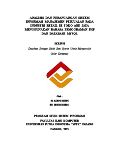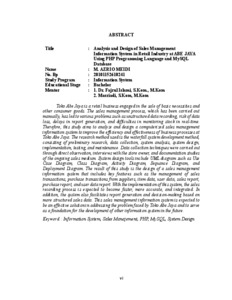 Toko Abe Jaya merupakan usaha rretail yang bergerak di bidang penjualan barang kebutuhan pokok dan barang konsumsi lainnya. proses pengelolaan penjualan yang dilakukan secara manual selama ini menimbulkan berbagai permasalahan, seperti pencatatan data yang tidak terstruktur, risiko kehilangan data, keterlambatan dalam pembuatan laporan, serta kesulitan dalam memantau stok barang secara real-time. Oleh karena itu, penelitian ini bertujuan untuk melakukan analisis dan perancangan sistem informasi manajemen penjualan yang terkomputerisasi guna meningkatkan efisiensi dan efektivitas proses bisnis di Toko Abe Jaya. Metode penelitian yang digunakan adalah metode pengembangan sistem waterfall yang terdiri dari tahap penelitian pendahuluan, pengumpulan data, analisi sistem, perancangan sistem, implementasi, pengujian dan maintenance. Teknik pengumpulan data dilakukan melalui observasi langsung, wawancara dengan pemilik toko, serta studi dokumentasi dari proses penjualan yang sedang berjalan. Sistem dirancang menggunakan bahasa pemograman PHP dengan database MySQL sebagai media penyimpanan data. Alat bantu yang digunakan dalam perancangan sistem meliputi diagram UML, seperti Use Case Diagram, Class Diagram, Activity Diagram, Sequance Diagram, dan Deployment Diagram. Hasil dari penelitian ini adalah rancangan sistem informasi manajemen penjualan yang mencakup fitur-fitur utama seperti pengelolaan data transaksi penjualan, data transaksi pembelian ke suplier, data barang, data user, laporan penjualan, laporan pembelian serta laporan data user. Dengan diterapkannya sistem ini, diharapkan proses pencatatan penjualan menjadi lebih cepat, akurat, dan terintegrasi. Selain itu, sistem ini juga memberikan kemudahan dalam penyusunan laporan dan pengambilan keputusan berbasis data penjualan yang lebih terstruktur. Sistem informasi manajemen penjualan ini diharapkan dapat menjadi solusi yang efektif dalam mengatasi permasalahan yang selama ini dihadapi oleh Toko Abe Jaya dan menjadi landasan pengembangan sistem informasi lainnya di masa yang akan data. Kata Kunci : Sistem Informasi, Manajemen Penjualan, PHP, MySQL, Perancangan Sistem