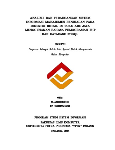 Meidi, Azrio (2025) ANALISIS DAN PERANCANGAN SISTEM INFORMASI MANAJEMEN PENJUALAN PADA INDUSTRI RETAIL DI TOKO ABE JAYA MENGGUNAKAN BAHASA PEMOGRAMAN PHP DAN DATABASE MYSQL. Sarjana thesis, Universitas Putra Indonesia YPTK Padang.